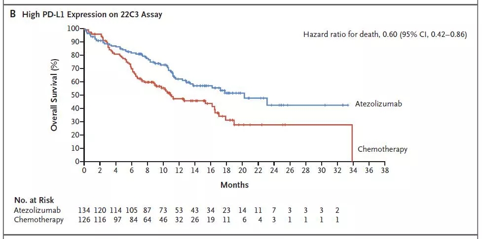 Atezolizumab一线治疗PD-L1≥50%的驱动基因阴性且晚期NSCLC患者,相较化疗可改善OS。