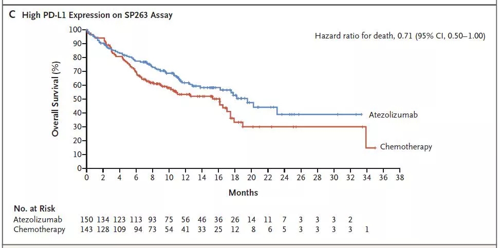 在驱动基因阴性且PD-L1≥1%的患者,基于22C3抗体检测的两组中位OS分别为17.8个月和14.0个月,基于SP263抗体检测的两组中位OS分别为17.8个月和14.0个月。