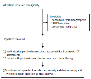 研究方法:该研究纳入人群为HER2阳性、18周岁及以上食管胃癌、ECOG评分0-2分、有或没有测量病灶,既往没有接受过PD-1和PD-L1治疗。治疗方案:首次用药帕博利珠单抗200mg 和曲妥珠单抗8mg/kg,第2周期联合化疗。化疗方案包括:奥沙利铂130mg/m2(或顺铂80mg/m2),卡培他滨1850mg/m2 d1-14(或者5-Fu 800mg/m 2d1-5)。首要研究终点6个月PFS率,研究假设为:37例患者中26例患者PFS达到6个月就认为该研究有意义。