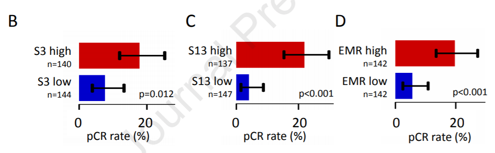 图2. 高或低S3(HRD)、S13(APOBEC)、EMR突变特征HR阳性肿瘤的pCR率