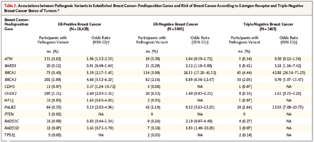 BARD1、RAD51C、RAD51D致病性变体与ER阴性乳腺癌和三阴性乳腺癌(TNBC)的风险增加相关,而ATM、CDH1、CHEK2致病性变体与ER阳性乳腺癌的风险增加相关。