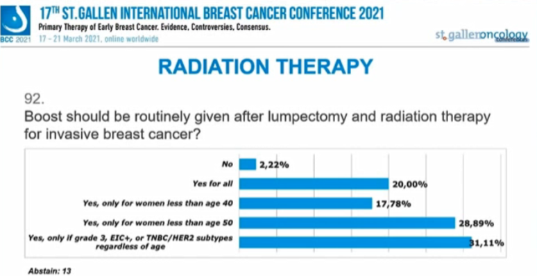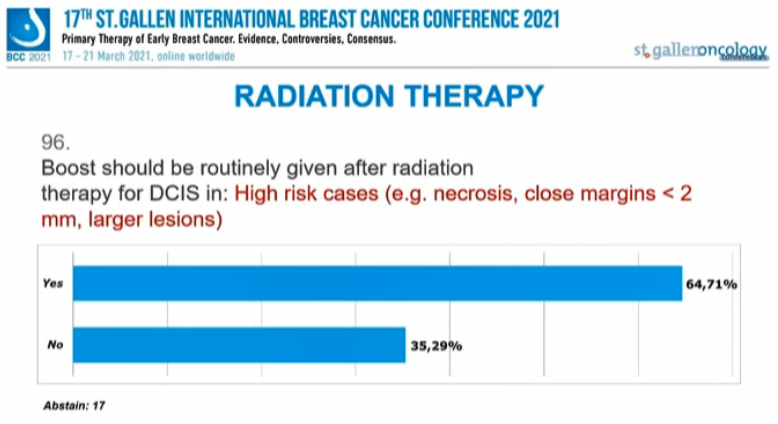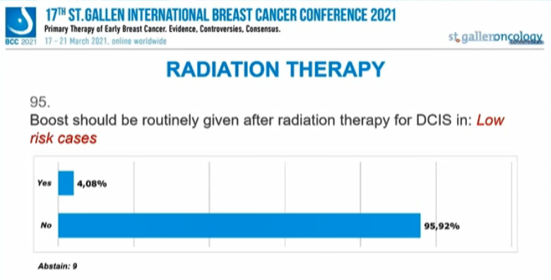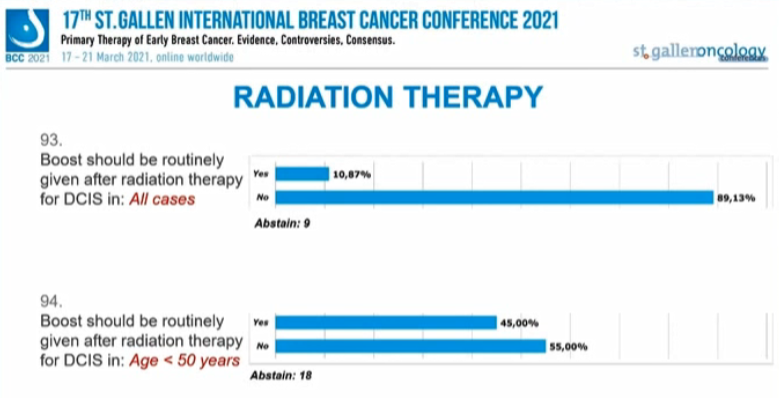 10.87%的专家选择“是”,89.13%的专家选择“否”;但对于年龄<50岁的DCIS患者,45%的专家支持常规加量,55%的专家不支持。