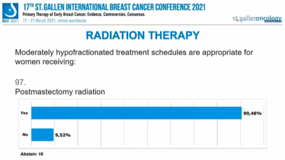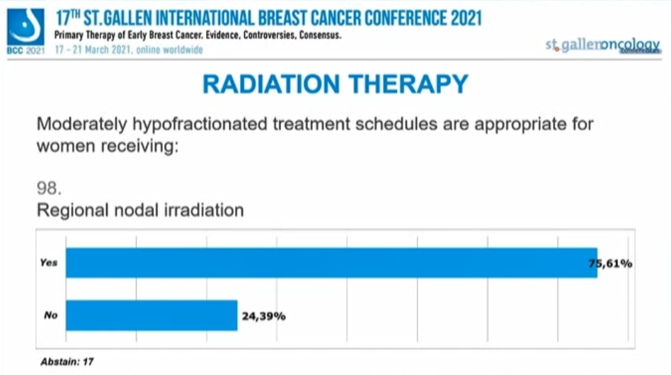 “乳房切除术后放疗”获得90.48%的专家支持,“区域淋巴结照射(RNI)”获得75.61%的专家支持。