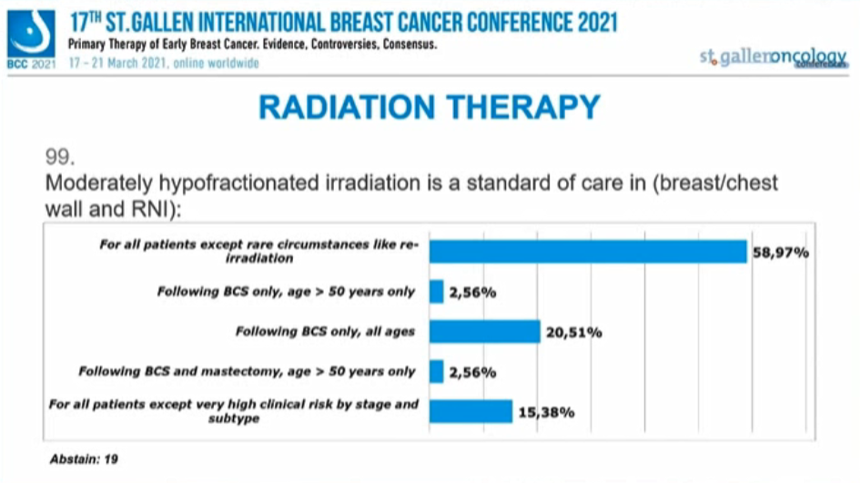 58.97%的专家选择“除了再程放疗等罕见情况以外的所有患者”,20.51%的专家选择“保乳术后,所有年龄”,15.38%的专家选择“除了临床分期和分型非常高危以外的所有患者”。选择“保乳术后,>50岁”以及“保乳和乳房切除术后,>50岁”的专家比例均为2.56%,另有19人弃权。