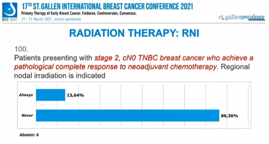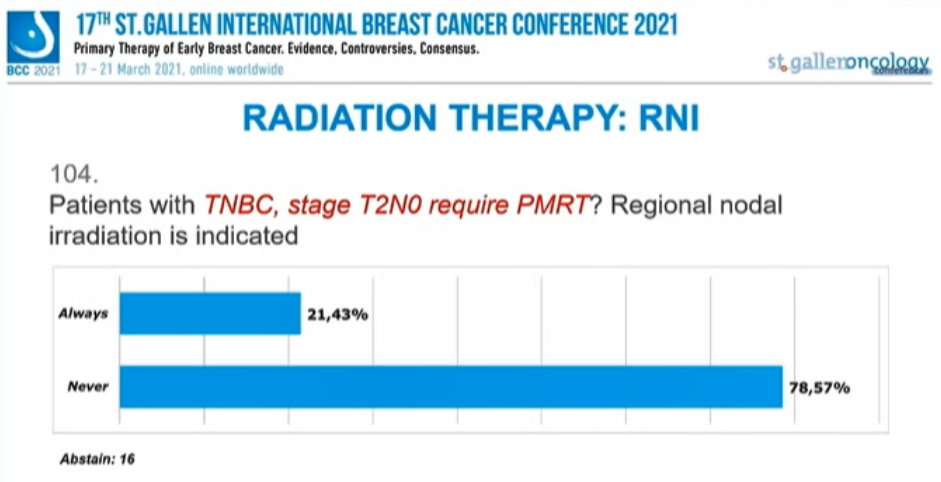 对于T2N0的TNBC患者,21.43%的专家持肯定意见,78.57%的专家持否定意见,另有16人弃权。