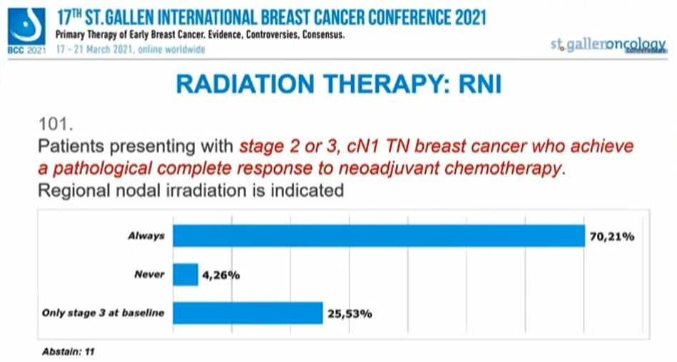 对于2期或3期、cN1的TNBC患者,70.21%的专家吃肯定意见,4.26%的专家持否定意见,25.53%的专家认为3期患者采需要,另有11人弃权。