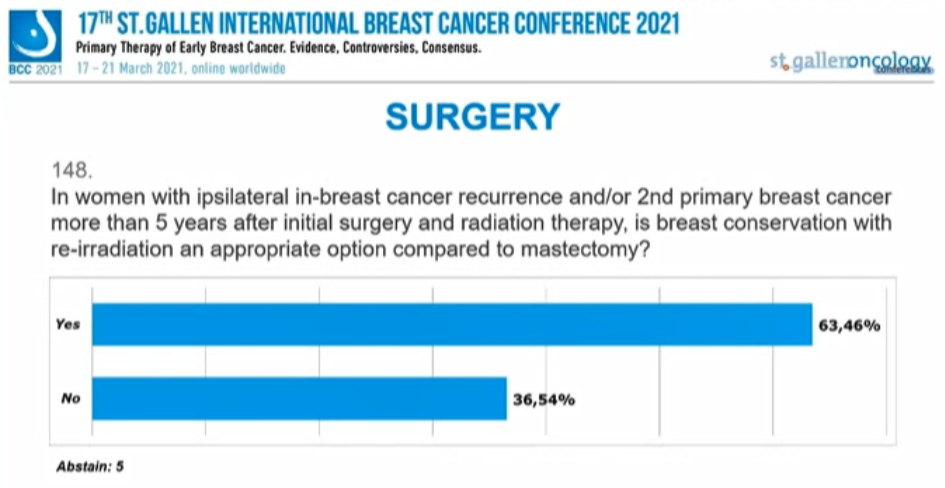 对于初次手术和放疗已超过5年而发生同侧乳腺癌复发和/或第二原发性乳腺癌患者,与乳房切除术相比,再程放疗+保乳是否合适?