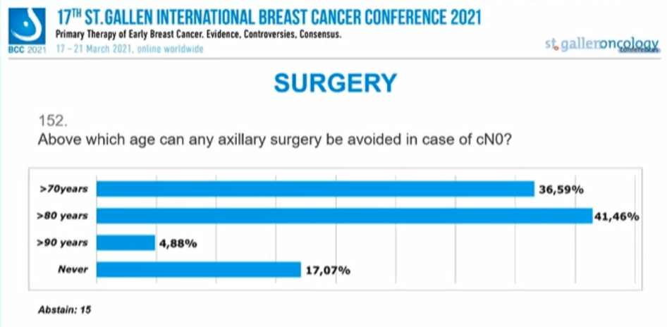 选择“>70岁”(36.59%)和“>80岁”(41.46%)的专家比例相近,4.88%的专家认为是“>90岁”,而17.07%的专家认为腋窝手术是无法避免的,另有15人弃权。