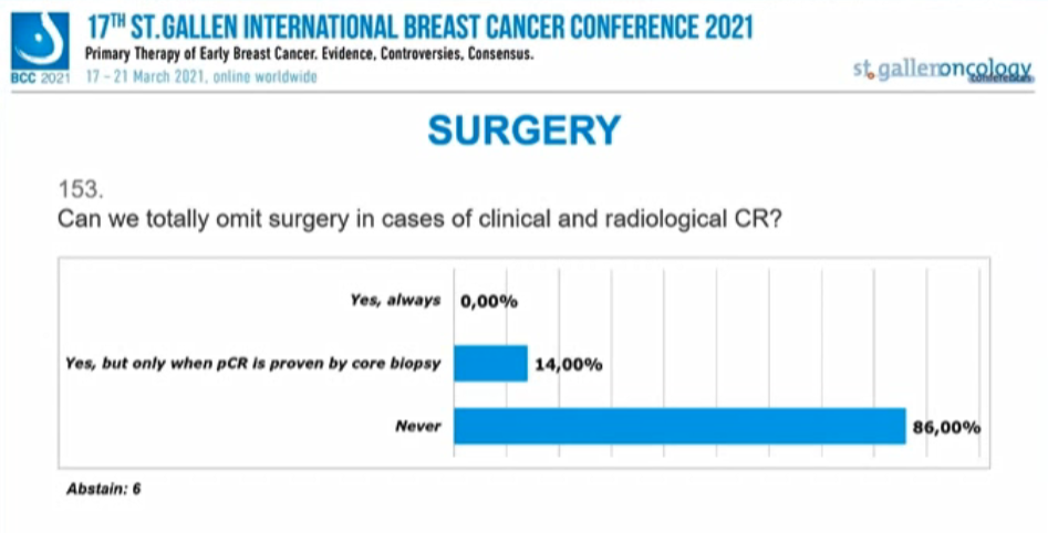 没有专家认为仅凭CR即可避免手术,14%的专家认为“针吸活检证实为pCR”可避免手术,绝大多数(86%)的专家认为无法避免手术。