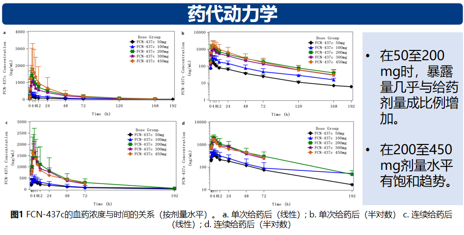 在连续给药50mg到200mg剂量水平中,暴露量(Cmax,AUC0-∞,AUC0-24,Cav-ss 24h)基本与给药量成比例增加。在连续给药200 mg到450 mg剂量水平,暴露量有饱和趋势。FCN-437c单药治疗的MTD确定为300 mg,根据安全性和PK数据将RP2D确定为200 mg。在15例可评估患者中有9例(60.0%)疾病稳定,但未观察到疗效。由于随访时间短,PFS和OS的数据尚未成熟。