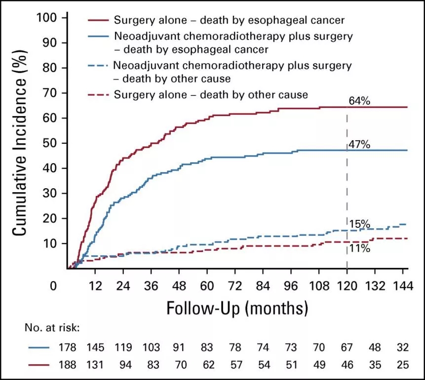 首次分析显示,两组的短期毒性均较低,新辅助放化疗后手术组和单纯手术组患者的2年生存率分别为67%和50%。5年的随访数据与最初的报告一致。研究人员指出,这种疗法的长期益处和危害尚不清楚。新辅助放化疗的副作用可能导致食管癌以外的其他原因导致的长期死亡,而且可能不能预防,而仅仅是推迟癌症相关的死亡。本次分析的目的是确定观察到的益处是否持续超过5年。