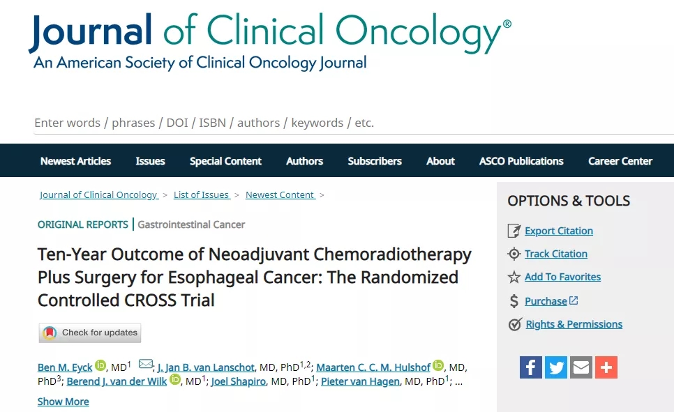 Ben M. Eyck, et al. Ten-Year Outcome of Neoadjuvant Chemoradiotherapy Plus Surgery for Esophageal Cancer: The Randomized Controlled CROSS Trial.JOURNAL OF CLINICAL ONCOLOGY. Publish date: May 12, 2021.