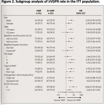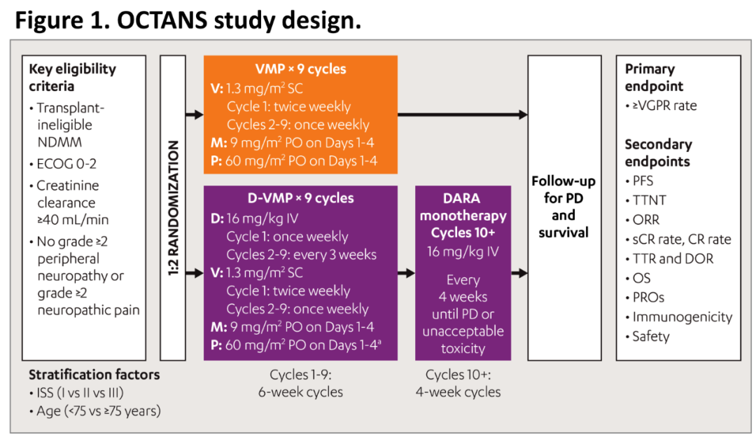 OCTANS研究的研究设计如图1所示。本研究的主要研究终点为非常好的部分缓解及以上 (≥VGPR)。220例患者被随机入组,其中146为D-VMP组,74例为VMP组。入组的患者主要来自中国大陆地区,同时也包括来自韩国、马来西亚、香港及台湾地区的患者。