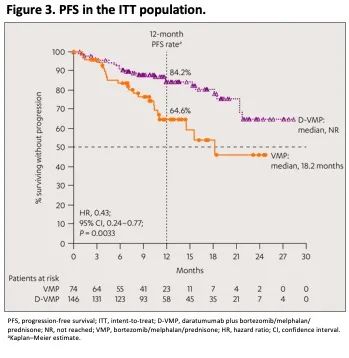 图3表明 D-VMP方案显著延长了 PFS,D-VMP组的中位 PFS截止到目前尚未达到,VMP组的中位PFS则为18.2个月。两组的12个月PFS率分别为:84.2% vs. 64.6%。