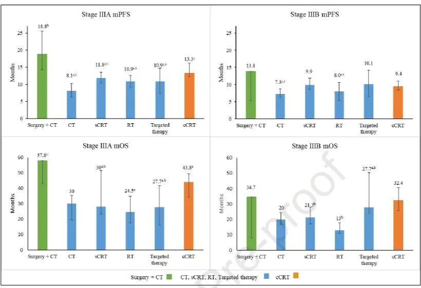 在可切除的患者中,新辅助化疗续贯手术或手术续贯术后辅助化疗,其中位PFS显著优于同步放化疗和单纯化疗,但OS并无差异。在不可手术的患者中,同步放化疗相较序贯放化疗、单纯化疗以及单纯放疗的患者,中位PFS和OS更优。仅接受手术治疗的IIIa期患者,其中位OS为62.6个月,接受术后辅助化疗,中位OS为57.9个月,接受术后辅助放疗中位OS为58.6个月;IIIb期患者同步放化疗后,中位OS为32.4个月(图3)。