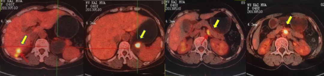 2013.5.10 PET-CT:肝肾隐窝、脾肾间隙、脾门旁、腹膜后可见斑片状、囊实性及结节状影,实质部分FDG代谢增高,考虑转移。