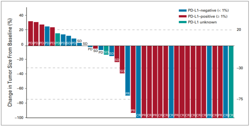 在可评估人群中,靶病变大小与基线相比,中位变化为−78.5%;有47.4%(18/38)的病灶完全清除。