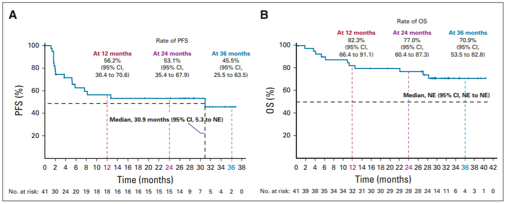 中位无进展生存期(PFS)为30.9个月(95%CI:5.3~NE),3年PFS率为45.5%(95%CI:25.5~63.5)。中位OS未达到;2年OS率为77.0%(95%CI:60.4~87.3)。