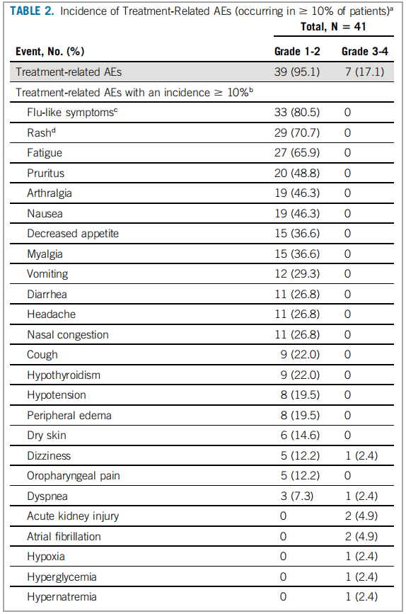 3/4级治疗相关不良事件率为17.1%(7/41),3/4级免疫介导的不良事件率为4.9%(2/41)。