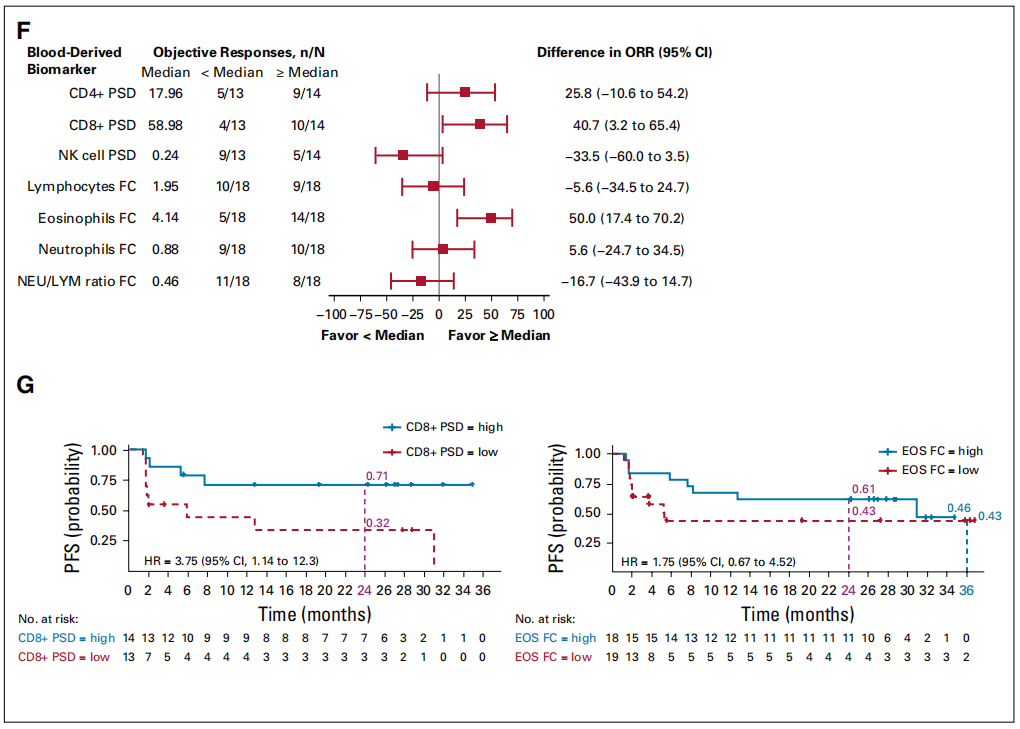 治疗后血液中CD8+和CD4+T细胞的多功能反应增强,治疗早期血液生物标志物(CD8+多功能强度差异和嗜酸性粒细胞)与治疗反应相关。