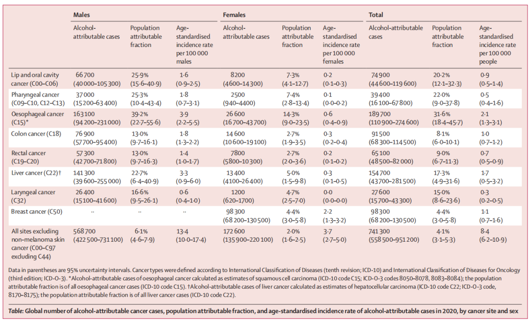 Rumgay, Harriet et al. “Global burden of cancer in 2020 attributable to alcohol consumption: a population-based study.” The Lancet. Oncology, S1470-2045(21)00279-5. 13 Jul. 2021, doi:10.1016/S1470-2045(21)00279-5