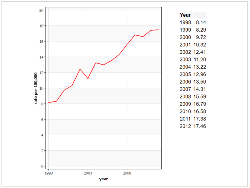 实际上,随着经济水平的发展、生活方式的西化,中国男性的前列腺癌发病率呈明显上升趋势(见下图),从1998年的8.14/10万人增长到2012年的17.46/10万人,短短十余年间翻了二倍多[3]。