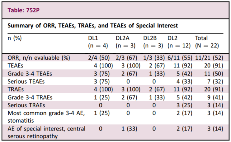 2020年ESMO大会报道了该研究的1b期结果,确定了2期推荐剂量(RP2D)为厄达替尼8 mg + Cetrelimab 240 mg。TRAE率为91%。在11名可评估患者中,ORR达55%,DCR达100%。