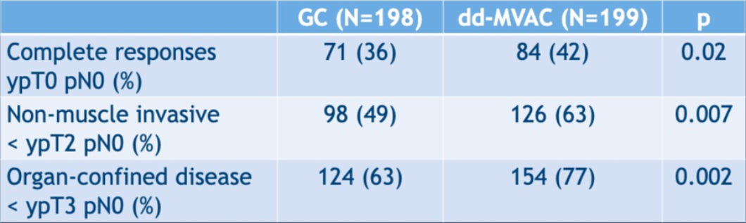 两组患者的毒性反应有显著差异,ddMVAC组相较于GC组≥3级不良事件率更高,包括贫血(22% vs 8%;P=0.00002)、中性粒细胞减少症(7% vs 2%;P=0.05)、恶心/呕吐( 10% vs 3%;P=0.03)和疲劳(14% vs 4%;P=0.0002)。ddMVAC组的病理缓解率较GC组显著提高(42% vs 36%,P=0.02)。