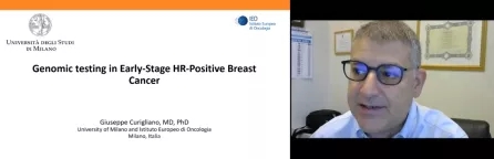Curigliano教授的报告内容聚焦如何评估ER阳性早期乳腺癌是否需要化疗,绝经前和绝经后患者的内分泌治疗方案。RxPONDER研究在RS评分0-25的区间患者比较化疗+内分泌和内分泌单药治疗。RxPONDER中期分析发现21基因RS 0-25具有预后作用,RS 0-25患者的化疗相对获益相似;RS 0-25的绝经后患者的任何亚组均未从辅助化疗中获益,RS 0-25的绝经前患者受益于内分泌加用化疗。具有1-3个阳性淋巴结且RS 0-25的绝经后妇女或可豁免辅助化疗,淋巴结阳性且RS 0-25的绝经前患者可能会从化疗中显著受益。