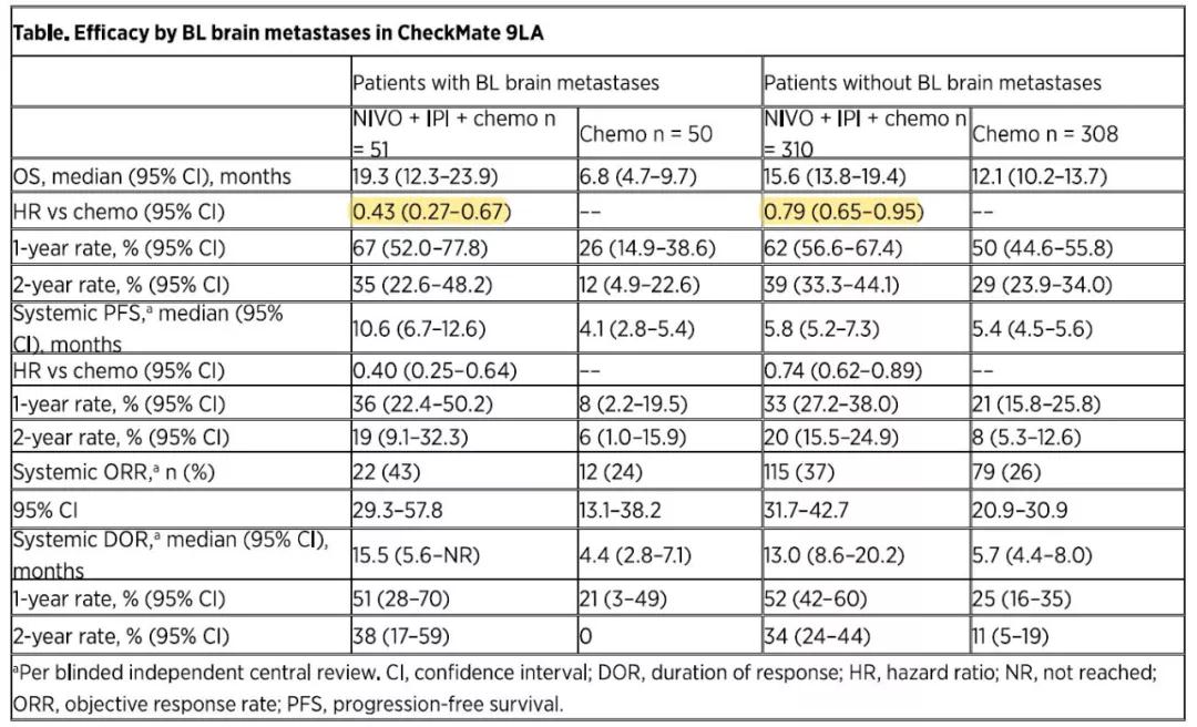 因此,这项研究显示,对于驱动基因阴性、基线有脑转移的NSCLC患者,双免疫联合化疗能为患者带来获益,这一结果可在未来的临床研究中进一步证实。至于双免疫联合化疗对脑转移病灶产生疗效的机制,是免疫治疗药物透过血脑屏障,抑或是活化了T细胞后起效,还需要进一步的研究探索。