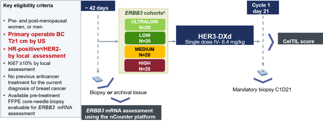 研究方法:纳入未经治疗HR+/HER2-可手术(≥1cm)乳腺癌患者,根据治疗前ERBB3 mRNA水平对患者从高到底进行分类,所有患者均给予单剂量HER3-DXd(6.4 mg/kg)治疗。主要终点是评估用药前后(第1周期第21天,C1D21)样本之间的CelTIL评分差异。次要研究终点包括:C1D21时临床评估的客观缓解率(ORR)以及安全性和耐受性等。