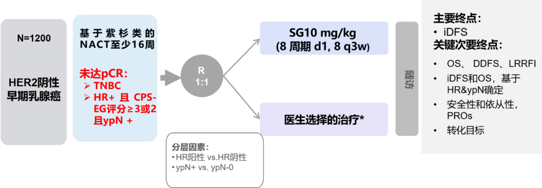 研究方法:纳入HER2阴性、新辅助化疗后有肿瘤残留,或HR阳性且伴有CPS+EG评分≥3,或激素受体(HR)阳性CPS+EG评分为2但新辅助化疗后ypN+。随机分组后患者接受术后辅助强化sacituzumab govitecan或医生选择的治疗(TPC,卡培他滨/铂/观察)。