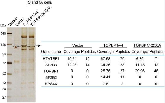 研究结果:为了研究TOPBP1促进的HR修复是如何调控的,我们首先对其不同BRCT结构域上的关键氨基酸进行突变分析,发现K250主要调控TOPBP1在S-G2期损伤位点积累,进一步通过质谱鉴定发现HTATSF1是S期TOPBP1结合蛋白(图1)。