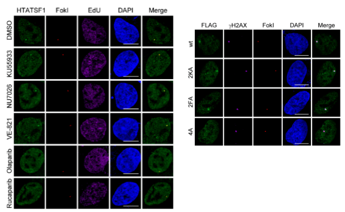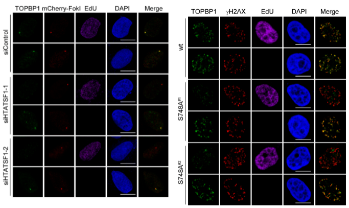 3、为了探究HTATSF1是否会影响TOPBP1在DSB处的募集,我们通过敲低HTATSF1发现S期TOPBP1在损伤位点的积累减少,同时发现HTATSF1是通过S748位点调控TOPBP1的积累(图4)。