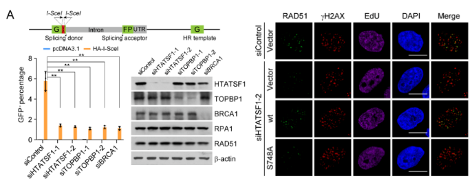 4、接下来,我们研究了HTATSF1-TOPBP1结合是否在同源重组修复中发挥作用,通过HR reporter实验发现HTATSF1敲低或突变(S748A)均会导致HR修复效率降低,并且我们发现HTATSF1能够有效的调控RPA-RAD51交换(图5)。