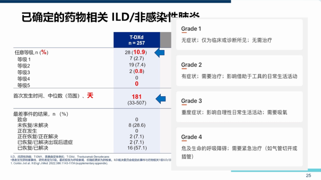 T-DXd最具有关注度的AE是间质性肺疾病(ILD),此次报道的ILD中位发生时间为181天,发生率为10.9%,其中3级ILD患者仅有2人(0.8%),值得欣慰的是DESTINY-Breast03研究中并未发生ILD导致的死亡。这是由于DESTINY-Breast03研究者非常重视ILD,在其治疗方案指南中有针对不同严重程度的ILD做出的预防、检测及治疗措施,以防其发展为重度或者死亡。