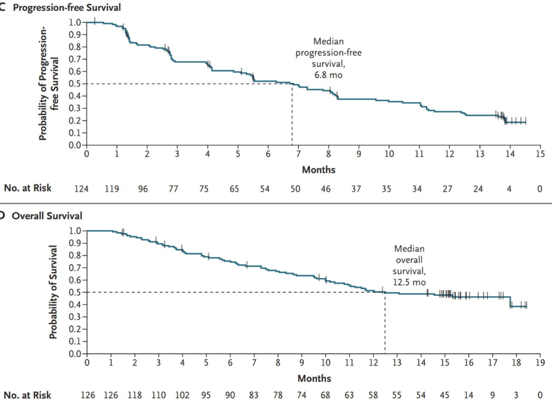 从安全性看,任何级别的治疗相关不良反应发生率为97.4%,其中1-2度为52.6%,3度及以上为44.8%,另有两例患者出现5度不良反应,并导致了6.9%的患者终止治疗。