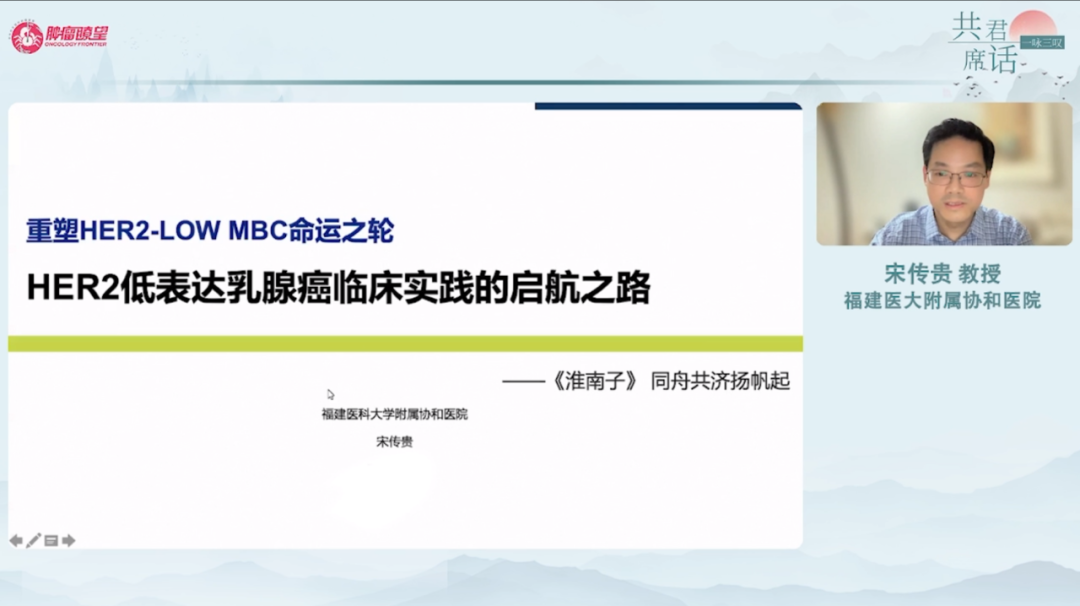 编者按:2022年9月2日,时值金秋,国内乳腺癌顶峰专家线上相聚,共此说丰年,携手举办“淮南子·DESTINY系列研讨会”。大会由解放军总医院江泽飞教授、中国科学技术大学附属第一医院潘跃银教授担任主席,会中福建医科大学附属协和医院宋传贵教授回顾了“HER2低表达乳腺癌临床治疗启航之路”,南昌市第三医院陈文艳教授对DESTINY-Breast03研究进行深入解读,与会专家针对HER2低表达的诊疗展开一场别开生面的思维碰撞。本文回顾与会专家讲课与讨论内容,整理如下,以飨读者。