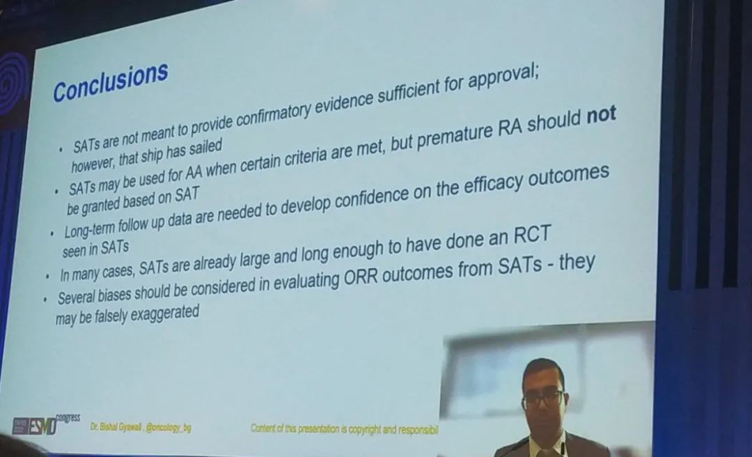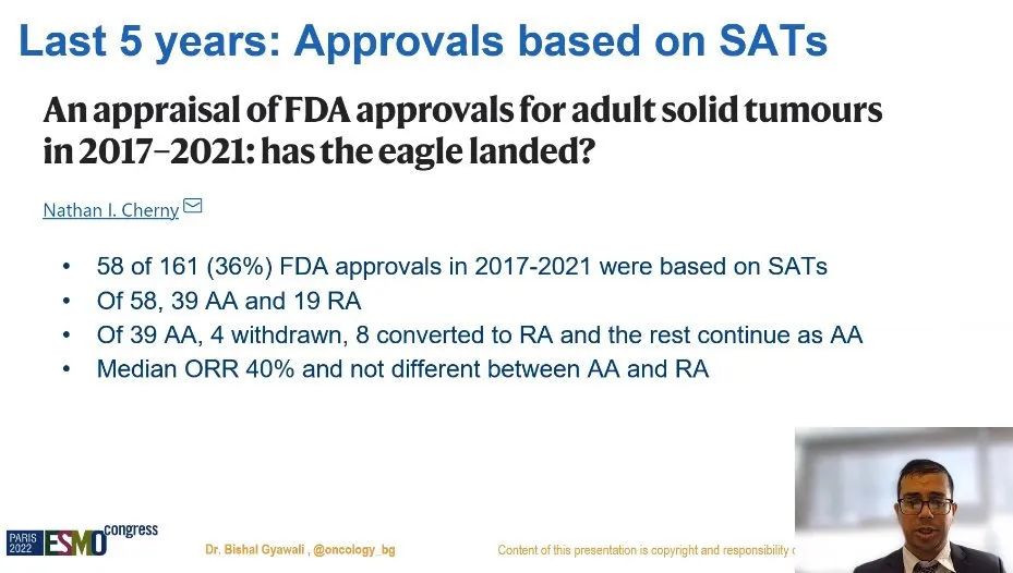 加拿大皇后大学肿瘤学系的Bishal Gyawali在2022 ESMO药物审批特别专场上作报告“单臂注册研究的长期随访:我们学到了什么”。