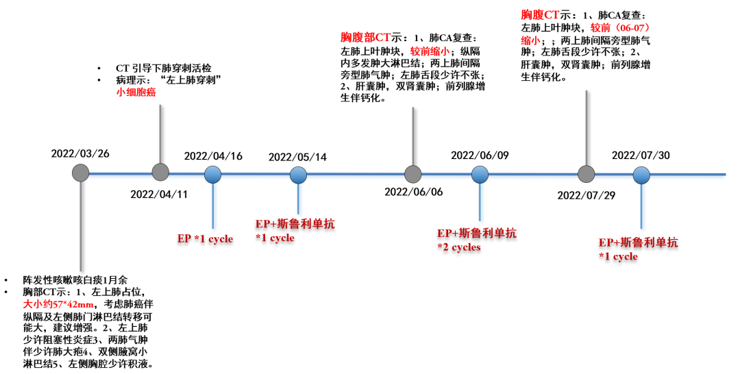 2022-04-20行依托泊苷+顺铂化疗治疗1周期(家属未同意使用PD-L1,考虑价格昂贵,生存获益少)。2022-05-14行依托泊苷+顺铂化疗第2周期,再度沟通病情及治疗情况,根据斯鲁利单抗ASTRUM-005研究数据及相对亲民的价格,家属决定使用免疫治疗,第2周期起联合斯鲁利单抗;2022-06-07评估病情示PR,胸腹部CT:1、肺CA复查:左肺上叶肿块,较前缩小(最大截面48*20mm);纵隔内多发肿大淋巴结;两上肺间隔旁型肺气肿;左肺舌段少许不张;2、肝囊肿,双肾囊肿;前列腺增生伴钙化。2022-06-09、07-03行依托泊苷+顺铂化疗,同时联合斯鲁利单抗免疫治疗2周期。2022-07-29评估病情示PR,胸腹部CT:1、肺CA复查:左肺上叶肿块,较前(2022-06-07)缩小;两上肺间隔旁型肺气肿;左肺舌段少许不张;2、肝囊肿,双肾囊肿;前列腺增生伴钙化。2022-07-30行依托泊苷+顺铂化疗,同时联合斯鲁利单抗免疫治疗1周期,患者目前仍在治疗疗程中。