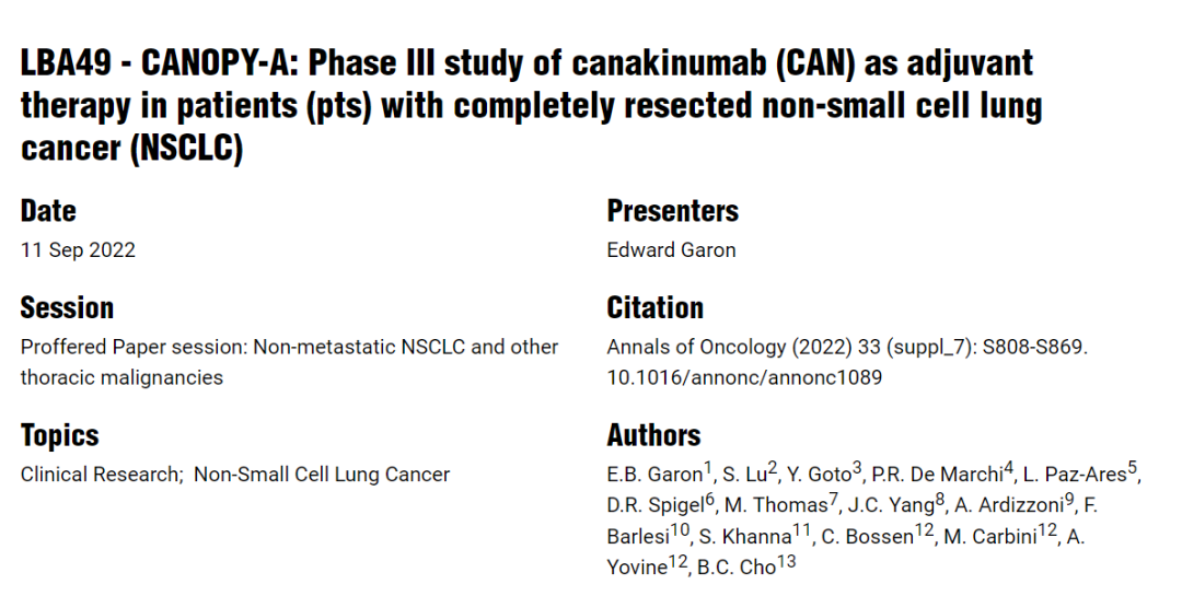 CANOPY-A研究探索了对于完全切除的非小细胞肺癌患者,在给予标准术后化疗后的基础上,进一步给予卡那奴单抗维持治疗的疗效及安全性。研究设计与IMPower-010研究设计类似。纳入了完全切除的II-IIIa非小细胞肺癌患者,患者接受含铂双药辅助治疗,未出现疾病进展的患者按照1:1的比例随机分为卡那奴单抗200mg,每三周治疗一次或安慰剂治疗,上限为一年,主要研究终点为DFS。申办方之所以进行此项研究,原因是在进行心血管系统疾病的研究中,发现了该药物可降低肺癌的死亡风险。如果以安慰剂的HR=1作为参照系,接受卡那奴单抗50 mg、150 mg和300 mg治疗的患者,其HR值分别为0.67,0.64和0.23。因此,研究者认为接受卡那奴单抗可能会降低肺癌的全因死亡风险,并分别在一线、后线和术后辅助治疗领域设计了卡纳奴单抗的应用。CANOPY-A研究则旨在探索该药在术后辅助治疗中的应用研究。