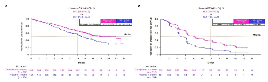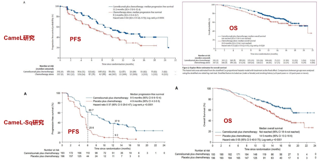 CameL研究:该研究中,联合免疫治疗组和单纯化疗组分别有205例和207例患者纳入分析,独立评审委员会评估的PFS分别为11.3个月和8.3个月,HR=0.6,12个月PFS率分别为49.6%和35.1%,中位OS分别为27.9个月和20.5个月,HR=0.73,P=0.017,ORR分别为60.5%和38.6%,P<0.001;DCR分别为87.8%和74.4%,P=0.003,中位响应持续时间分别为17.6个月和9.9个月,两组分别有69%和47%的患者出现3度及以上治疗相关不良反应,严重不良反应发生率分别为36%和13%。