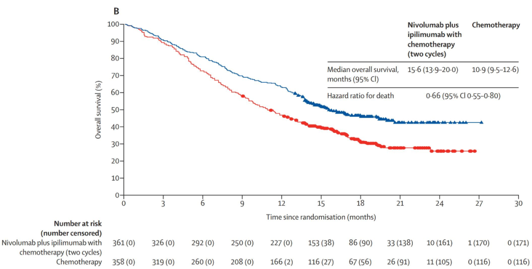 CheckMate-9LA研究:该研究则是在CheckMate-227研究的基础上,按照1:1的比例接受Nivolumab联合Ipilimumab并进一步联合两周期化疗(联合治疗组)或单独化疗(单纯化疗组),最终,联合免疫治疗组及单纯化疗组分别入组361例和358例患者,经过全组中位13.2个月的随访后,两组的中位OS分别为15.6个月和10.9个月,HR=0.66,12个月OS率分别为63%和47%,中位PFS分别为6.7个月和5.0个月,HR=0.68,两组3-4度治疗相关不良反应发生率分别为47%和38%。两组均有2%的患者因治疗相关的不良反应导致死亡事件出现
