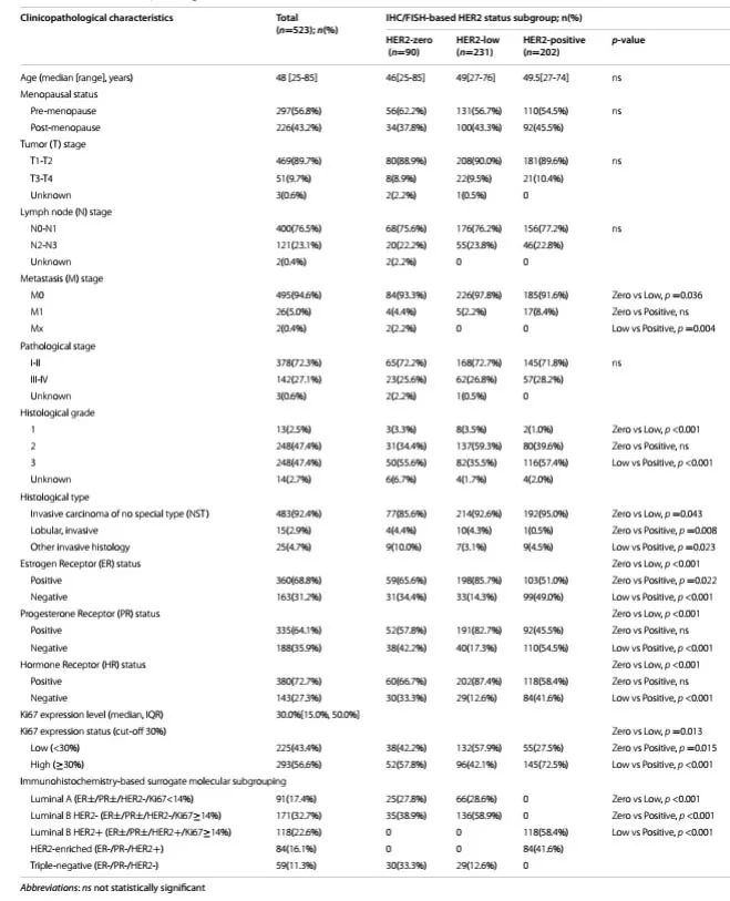 该研究纳入523例乳腺癌女性患者,中位年龄为48岁(范围25-85岁)。大多数队列由早期乳腺癌(72.3%,n=378)、无特殊类型浸润性癌(NST)(92.4%,n=483)和HR阳性乳腺癌(72.7%,n=380)患者组成。基于2018年ASCO/CAP指南,根据HER2状态对队列进一步分层。根据指南,共有321例患者为HER2阴性,包括90例(17.2%)IHC 0患者(定义为HER2 0),231例(44.2%)IHC 1+或IHC 2+且FISH阴性患者(定义为HER2低表达)。其余为202例(38.6%)IHC 3+或IHC 2+FISH阳性患者(定义为HER2阳性)(图1)。表1总结了各队列和患者亚组的临床病理学特征。根据HER2状态分层的患者具有相似的年龄、绝经状态和病理分期分布,但组织学类型、组织学分级、激素受体(HR)状态、Ki67表达水平和基于IHC的分子亚组状态具有统计学差异。