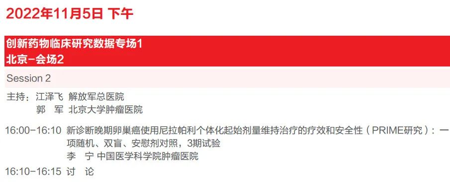 创新药物临床研究数据专场包括多个session,其中session 2展示了一项名为PRIME的卵巢癌研究数据。