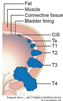膀胱癌的分期指肿瘤浸润深度及转移情况,是判断膀胱肿瘤预后的最有价值的参数。按照TNM分期,膀胱癌可分为非肌层浸润性膀胱癌(CIS, Ta和T1)和肌层浸润性膀胱癌(T2以上)(图1)。