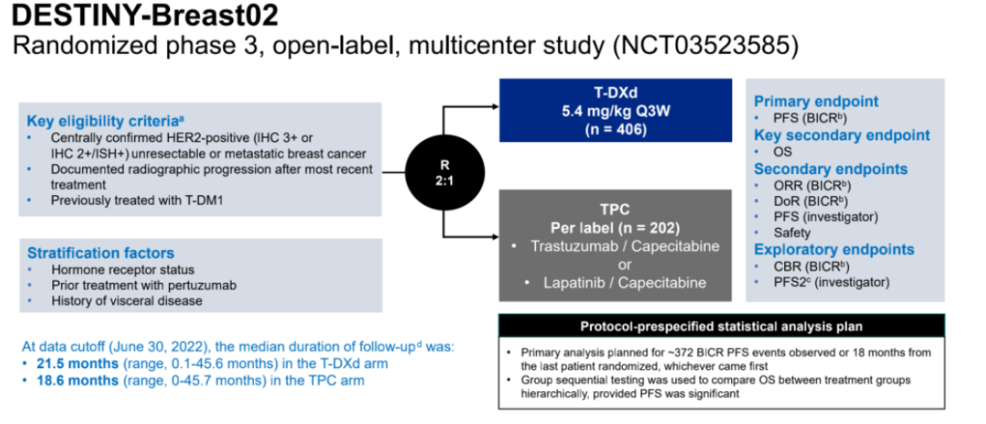 2022年圣安东尼奥乳腺癌研讨会(SABCS)上,Ⅲ期DESTINY-Breast02研究(NCT03523585)结果公布,数据显示与医生选择的治疗(TPC)相比,T-DXd(Enhertu)在晚期HER2阳性不可切除和/或转移性乳腺癌患者中的死亡风险下降34%。