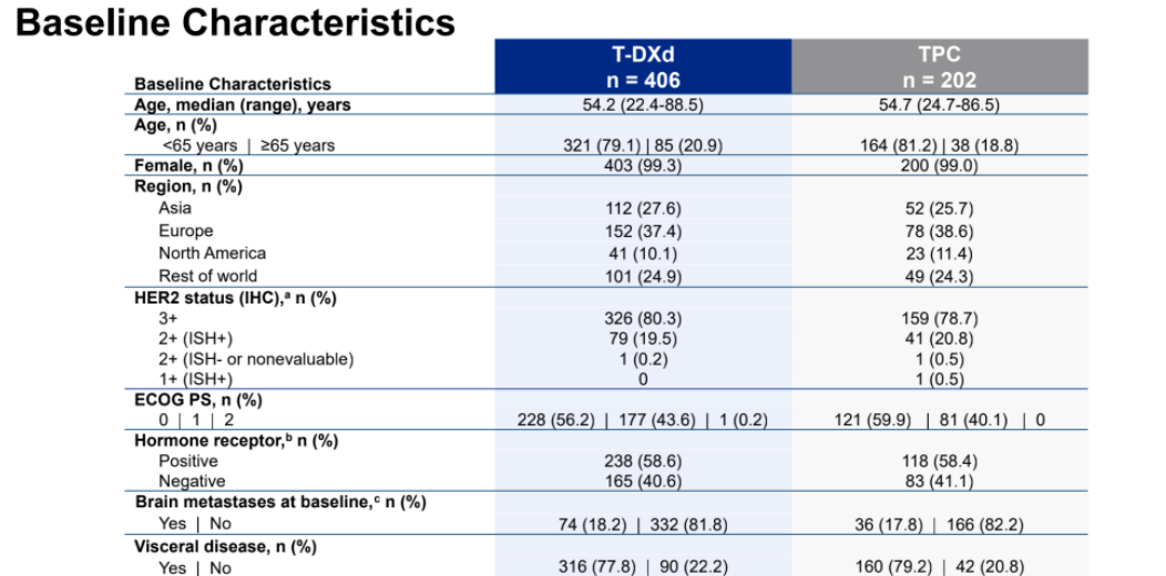 接受T-DXd治疗的患者中位年龄为54.2岁,中位治疗时间为11.3个月。接受TPC治疗的患者中位年龄为54.2岁,中位治疗时间约为4.5个月。T-DXd组的客观有效率为69.7%,而TPC组为29.2%。
