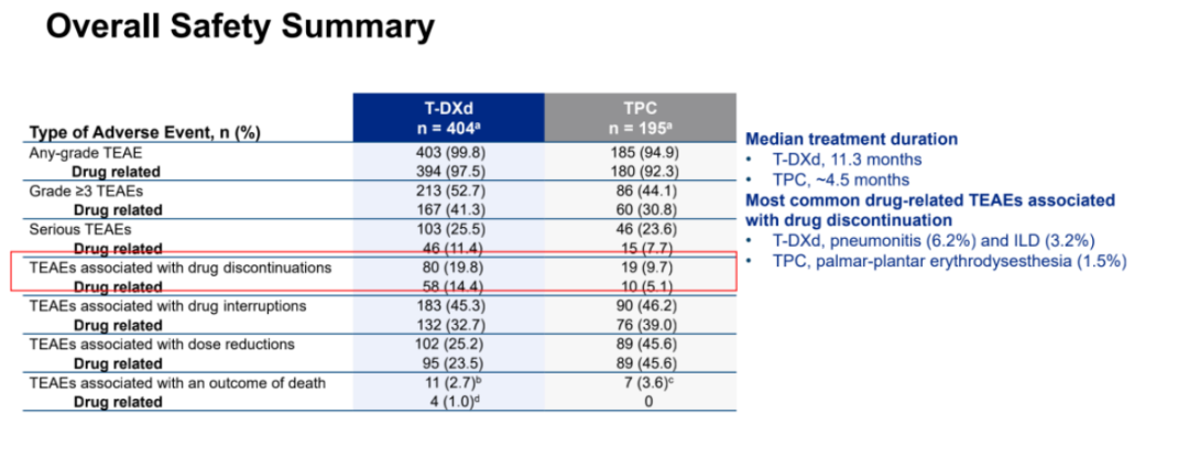 Ian Krop博士还在报告中分享了由于药物不良反应而不得不停止治疗的患者比例:T-DXd组为14%,TPC组为5%。他指出,这些患者大多数由于间质性肺疾病或肺炎而不得不停止治疗。