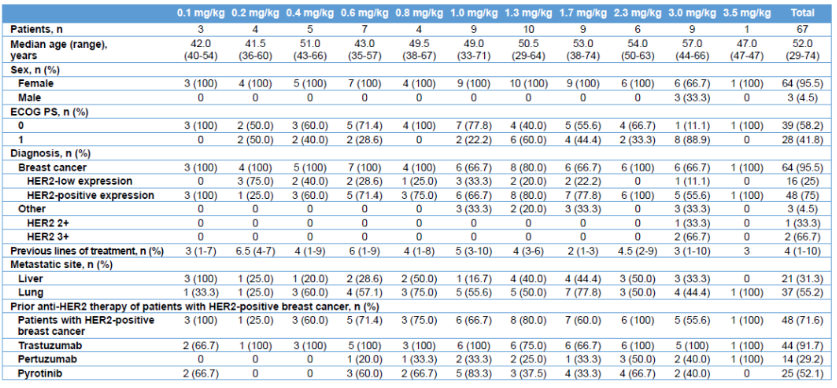 研究入组67例患者,其中64名为乳腺癌,3例为其它实体瘤。乳腺癌患者中48例(75%)为HER2阳性,16例(25%)为HER2低表达。患者平均接受过4线治疗,91.7%的患者接受过曲妥珠单抗治疗。